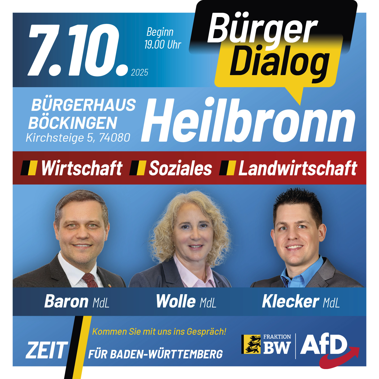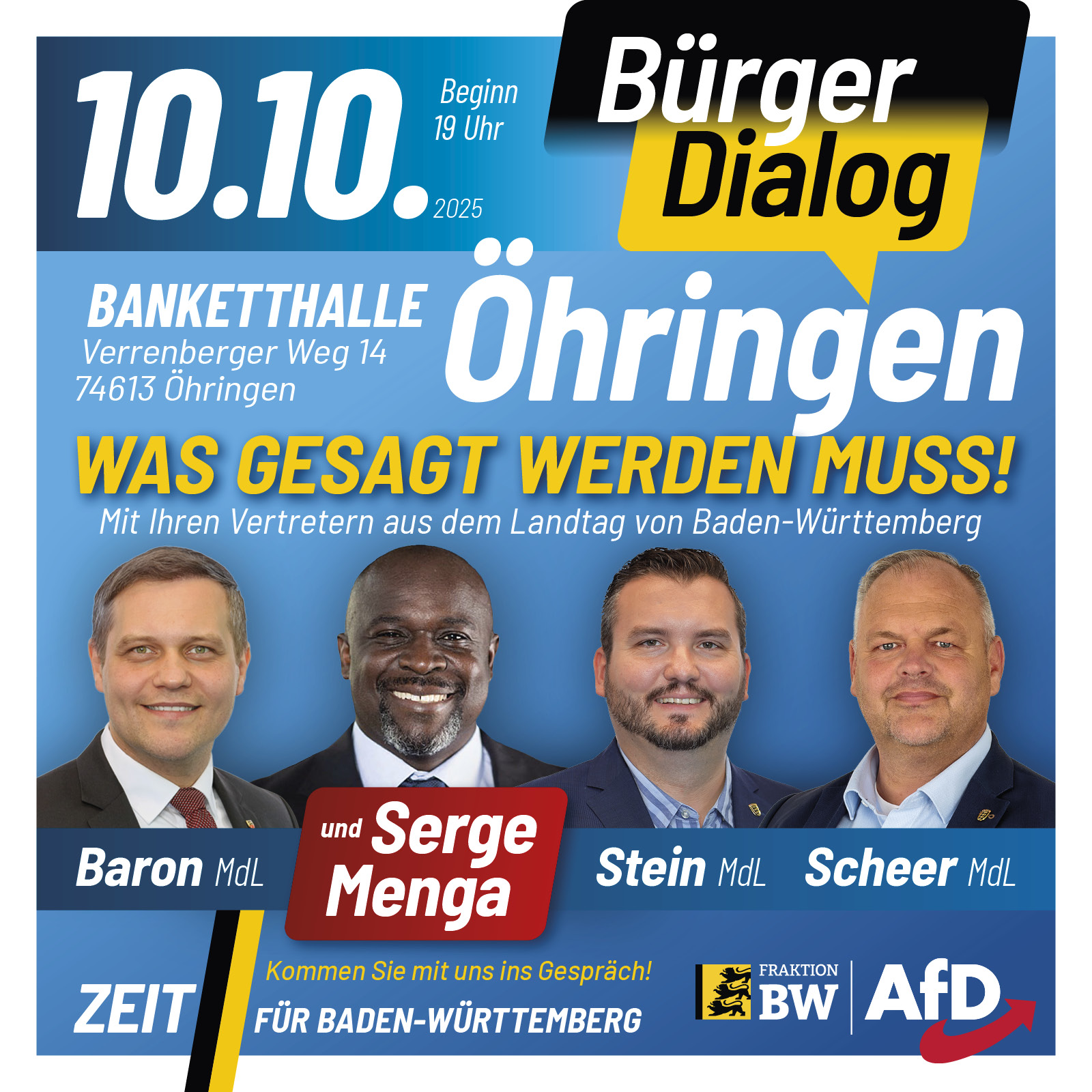 Der Bürgerdialog findet am Freitag, den 10. Oktober 2025 in der Banketthalle Öhringen statt. Beginn der Veranstaltung ist 19:00 Uhr, Einlass ab 18:00 Uhr.