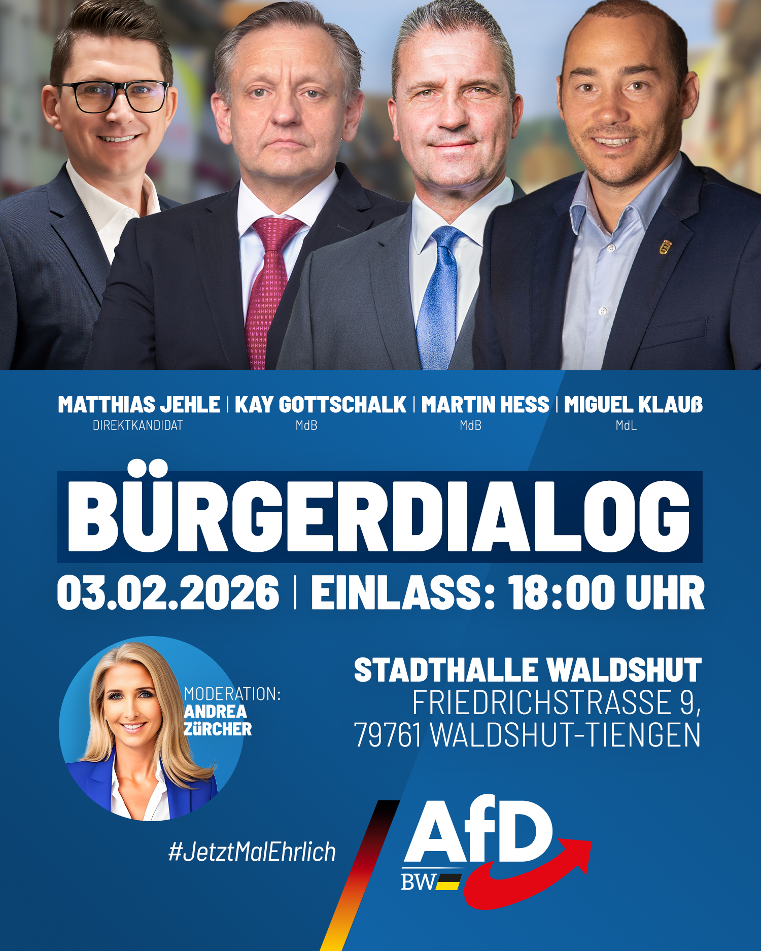 Wir laden Sie herzlich zu einer politischen Veranstaltung mit Redebeiträgen der AfD am Dienstag, den 03. Februar 2026 in der Stadthalle Waldshut