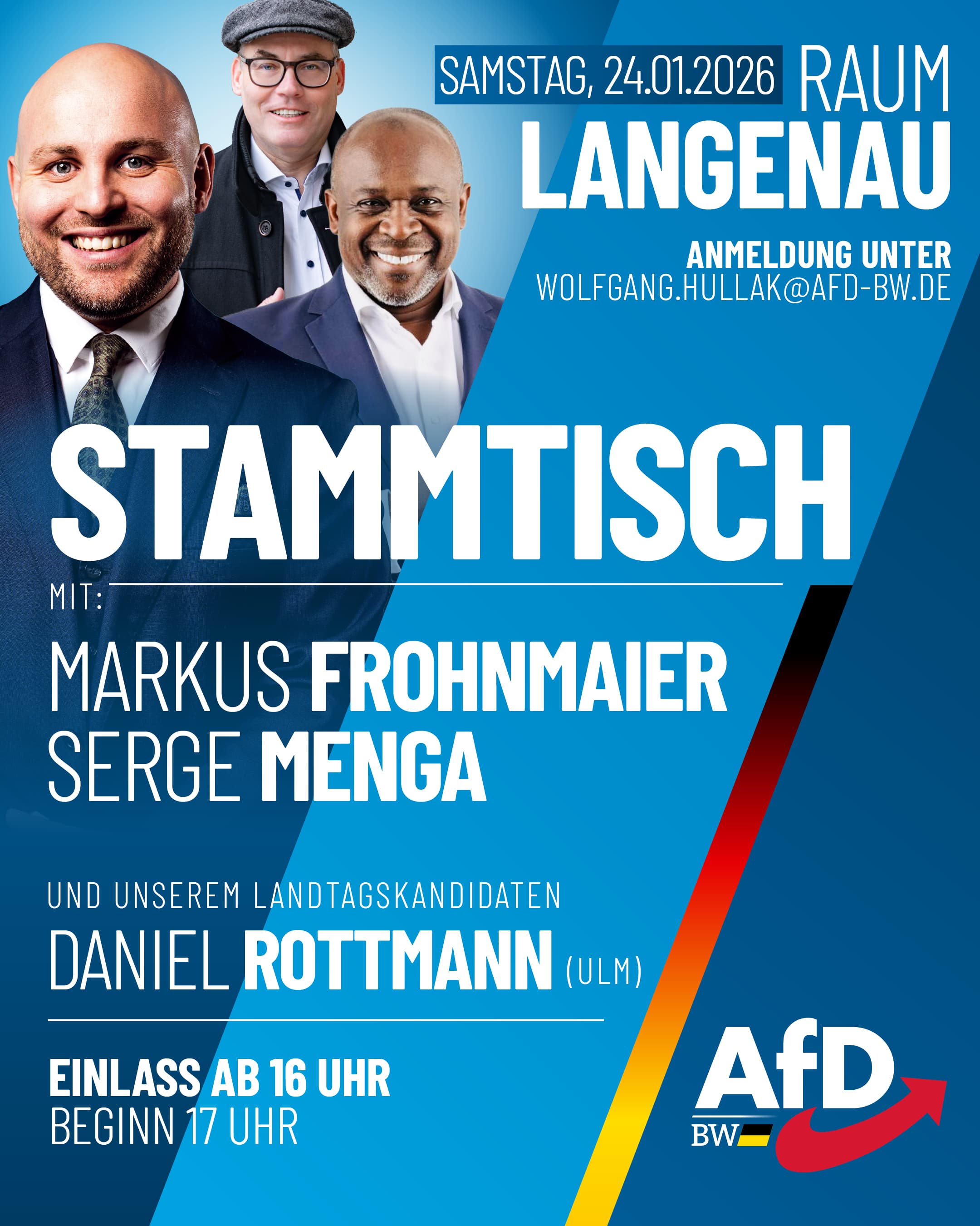 Einladung zum Stammtisch mit Markus Frohnmaier, Serge Menga und unserem Direktkandidaten Daniel Rottmann in Langenau.