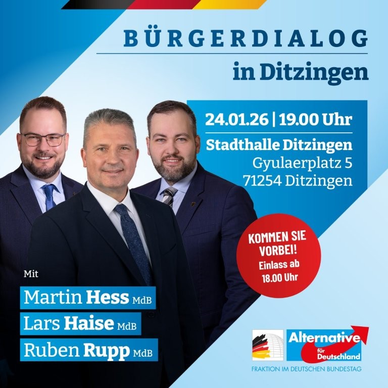 Hiermit laden wir Euch alle herzlich zur AfD Großveranstaltung am Freitag, den 20. Februar 2026 um 19:00 Uhr (Einlass ab 18:15 Uhr) in die Stadthalle Aalen, Berliner Platz 1 in 73430 Aalen ein.